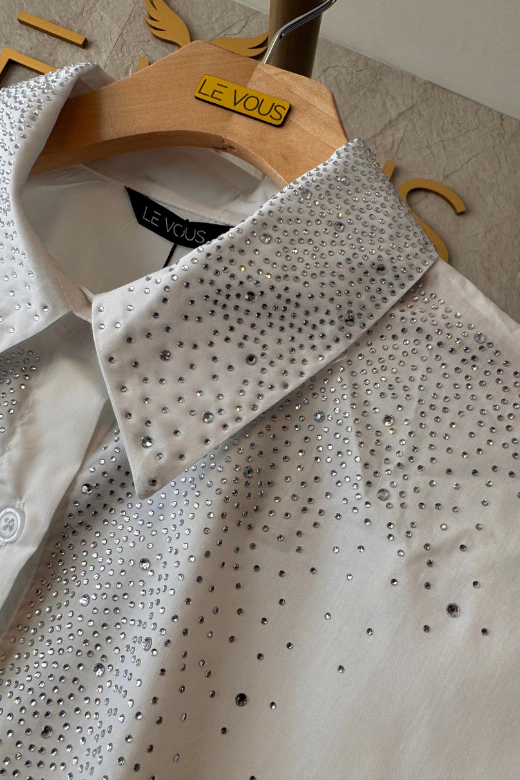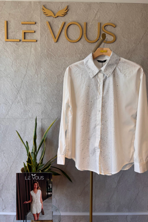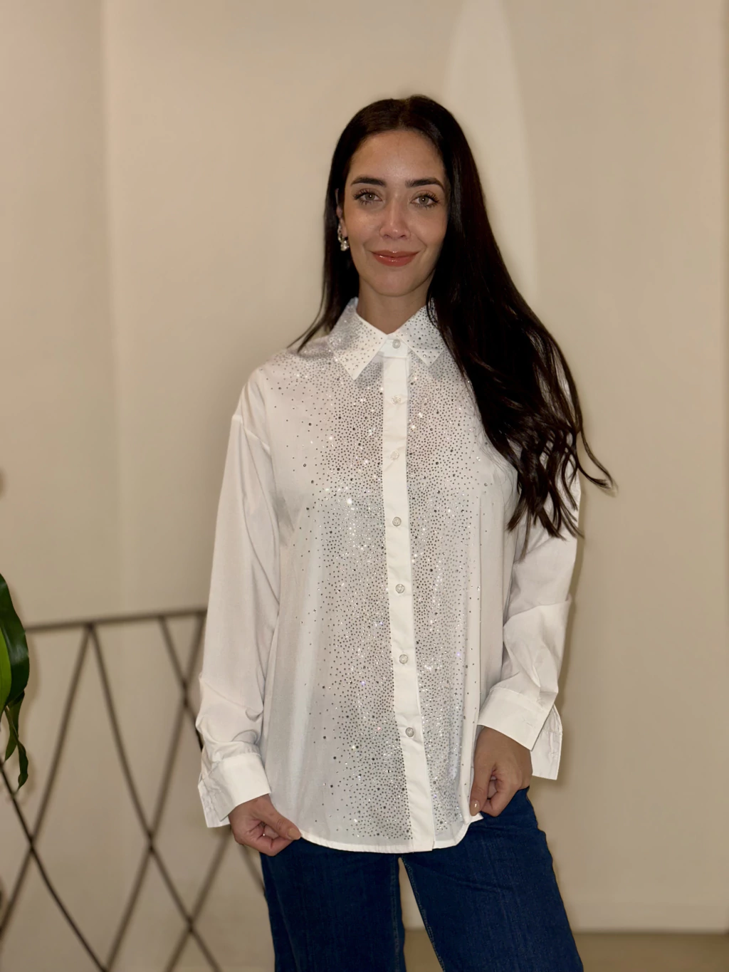 Descubrí la Camisa PERRY, una prenda elegante con mangas largas que realzan tu estilo. Su diseño se destaca por los delicados detalles en strass ubicados en el cuello, frente y mangas, aportando un brillo sutil y sofisticado.
