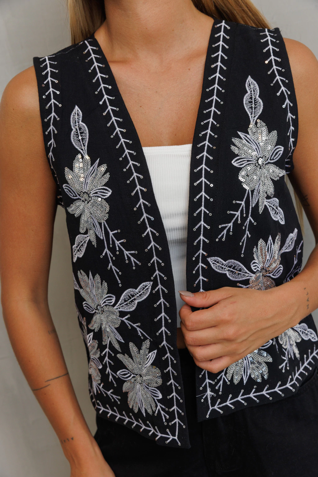 Chaleco Zorzal combina base de lino con bordados florales y detalles en lentejuelas que capturan la luz de manera única. Una prenda versátil que podés usar arriba de un top básico o como protagonista de tu look.
