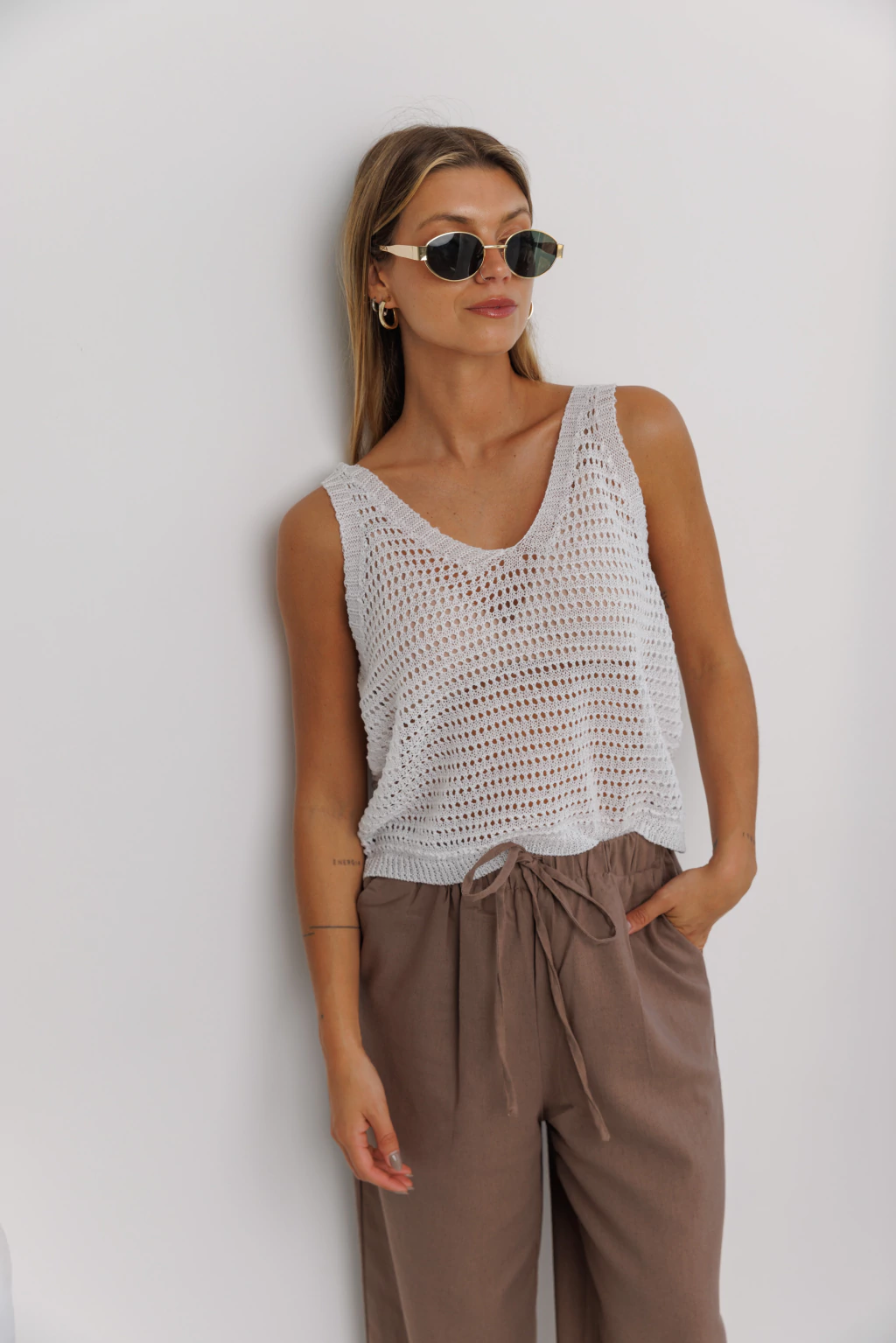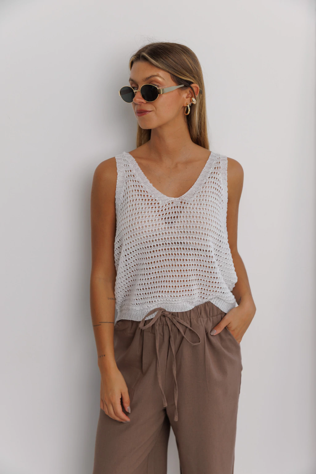 Musculosa tejida con diseño calado, ideal para los días de verano. Su tejido liviano y fresco la convierte en una prenda perfecta para looks relajados y con estilo. Con escote en V y terminación recta, podés usarla sola o superponerla sobre tu traje de baño o un top liso para un look más urbano.