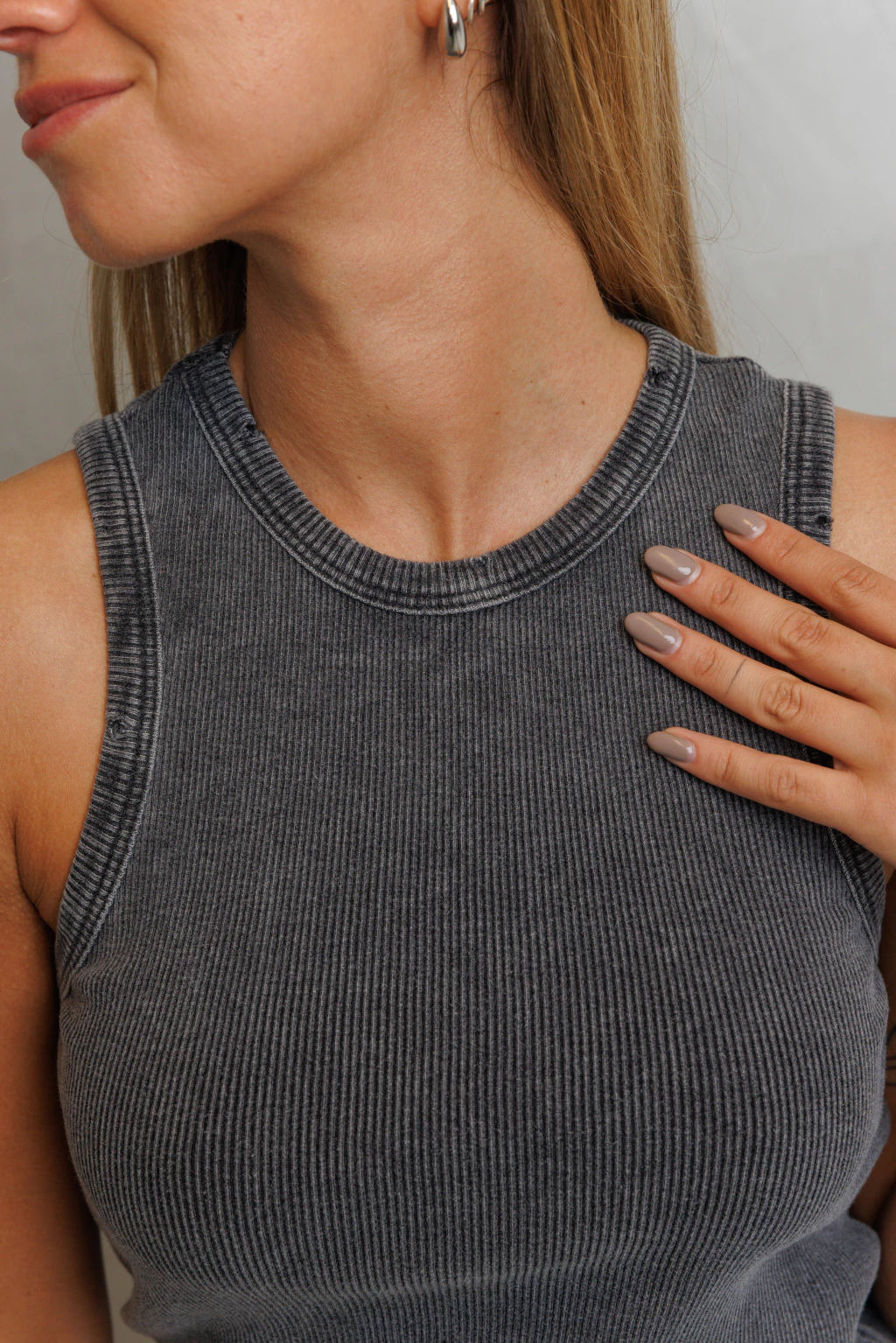 Sumá un toque urbano a tu look con esta musculosa de morley algodón con efecto desgastado, perfecta para usar todos los días. Su diseño clásico de escote redondo y sisa amplia la convierte en una prenda cómoda y versátil, ideal para llevar sola o en capas.
