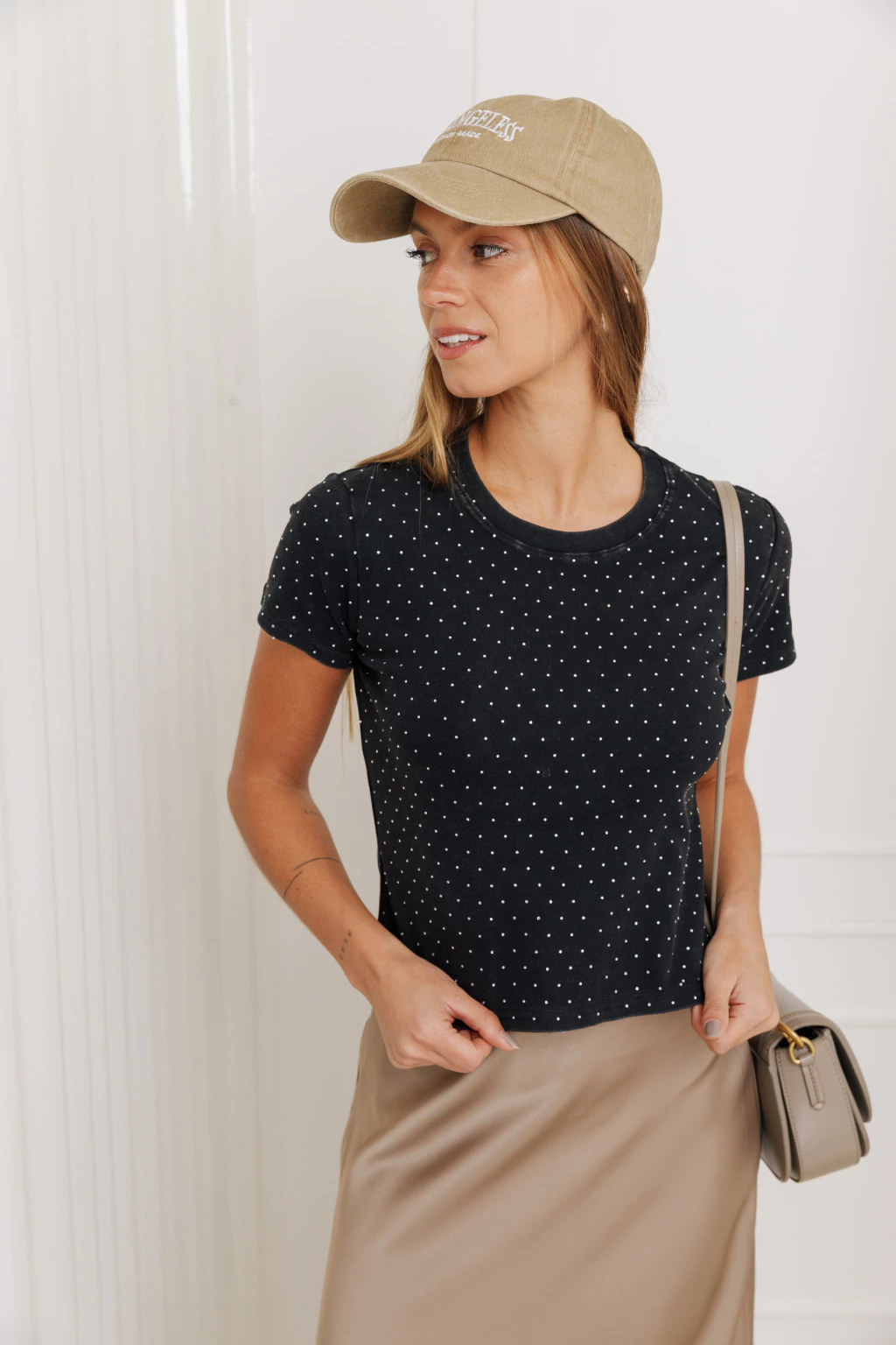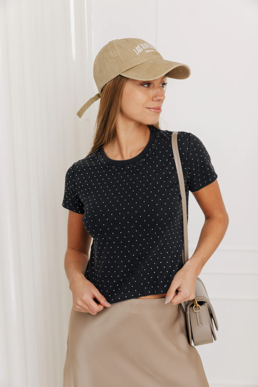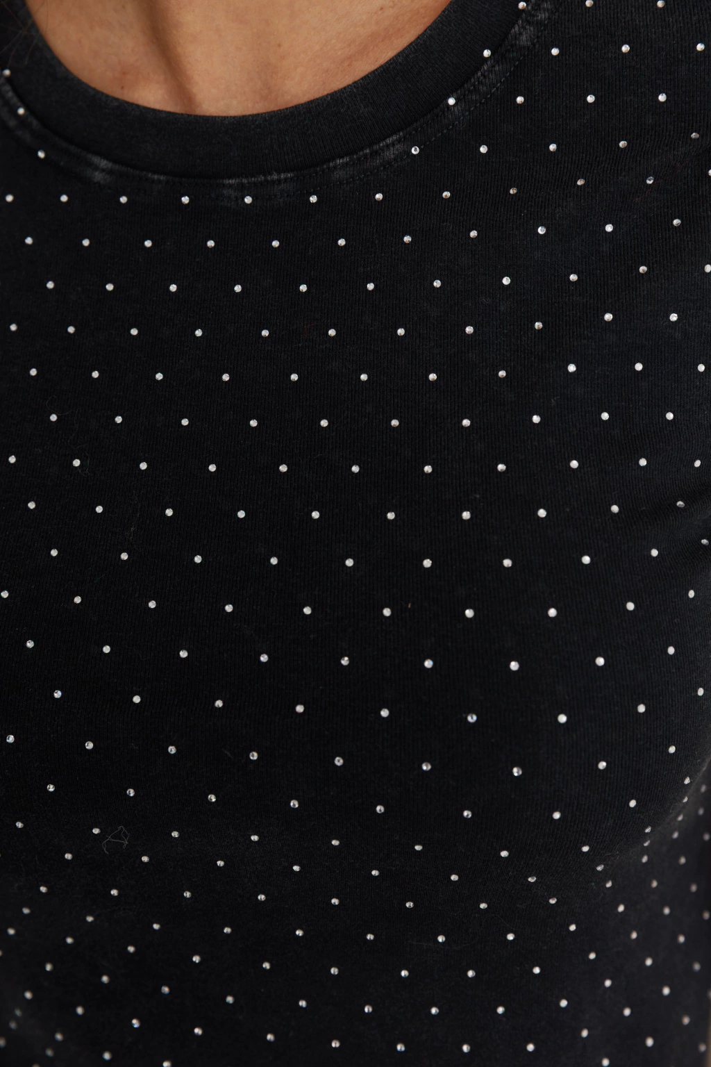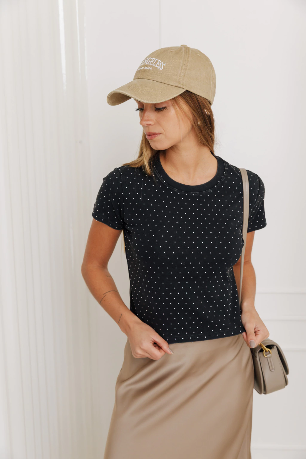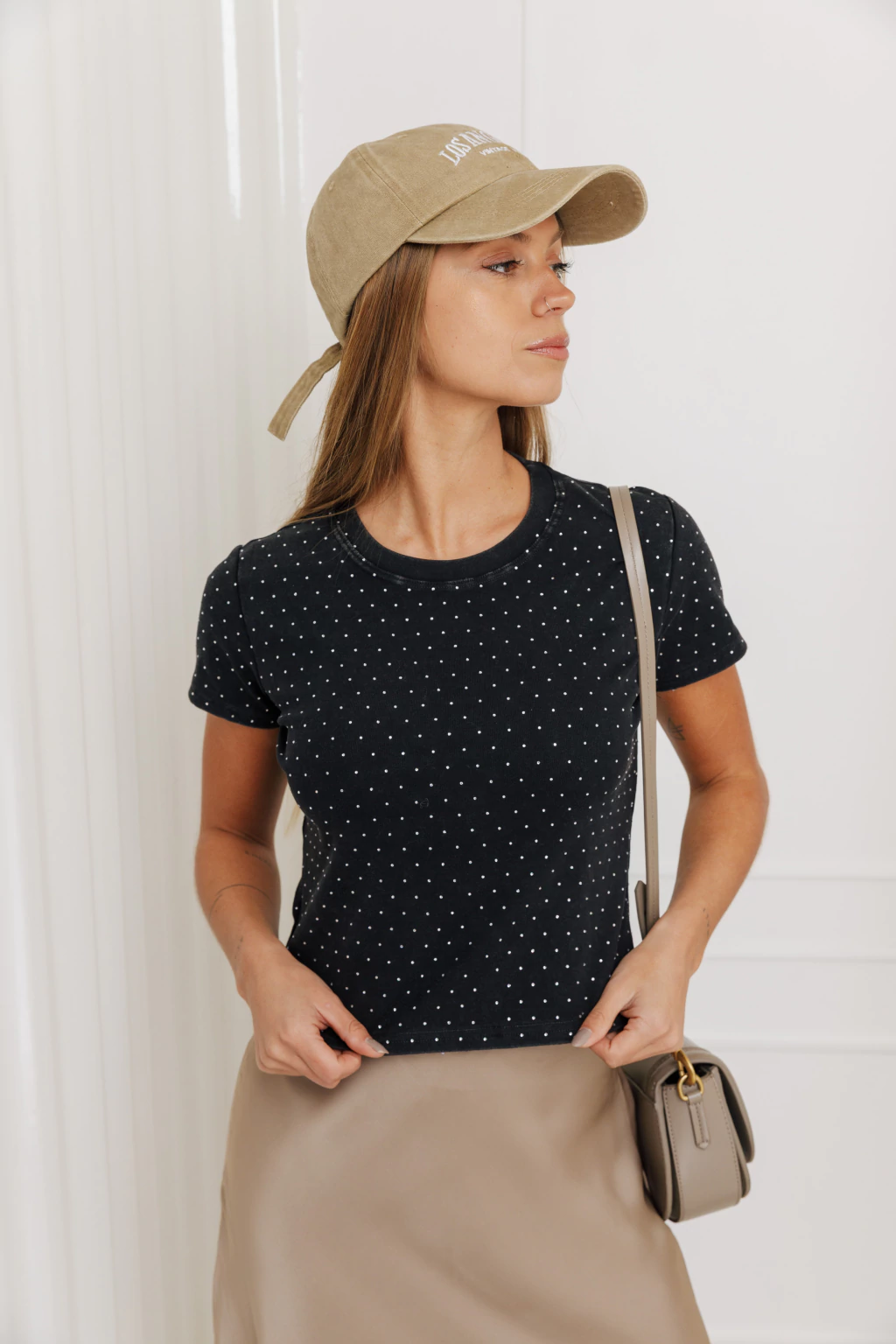 Descubrí la Remera GERANIO - Negra, confeccionada en algodón suave que garantiza confort y durabilidad. Esta prenda crop de manga corta destaca por su diseño elegante, realzado con strass delicados tanto al frente como en la espalda, aportando un brillo sutil y sofisticado.