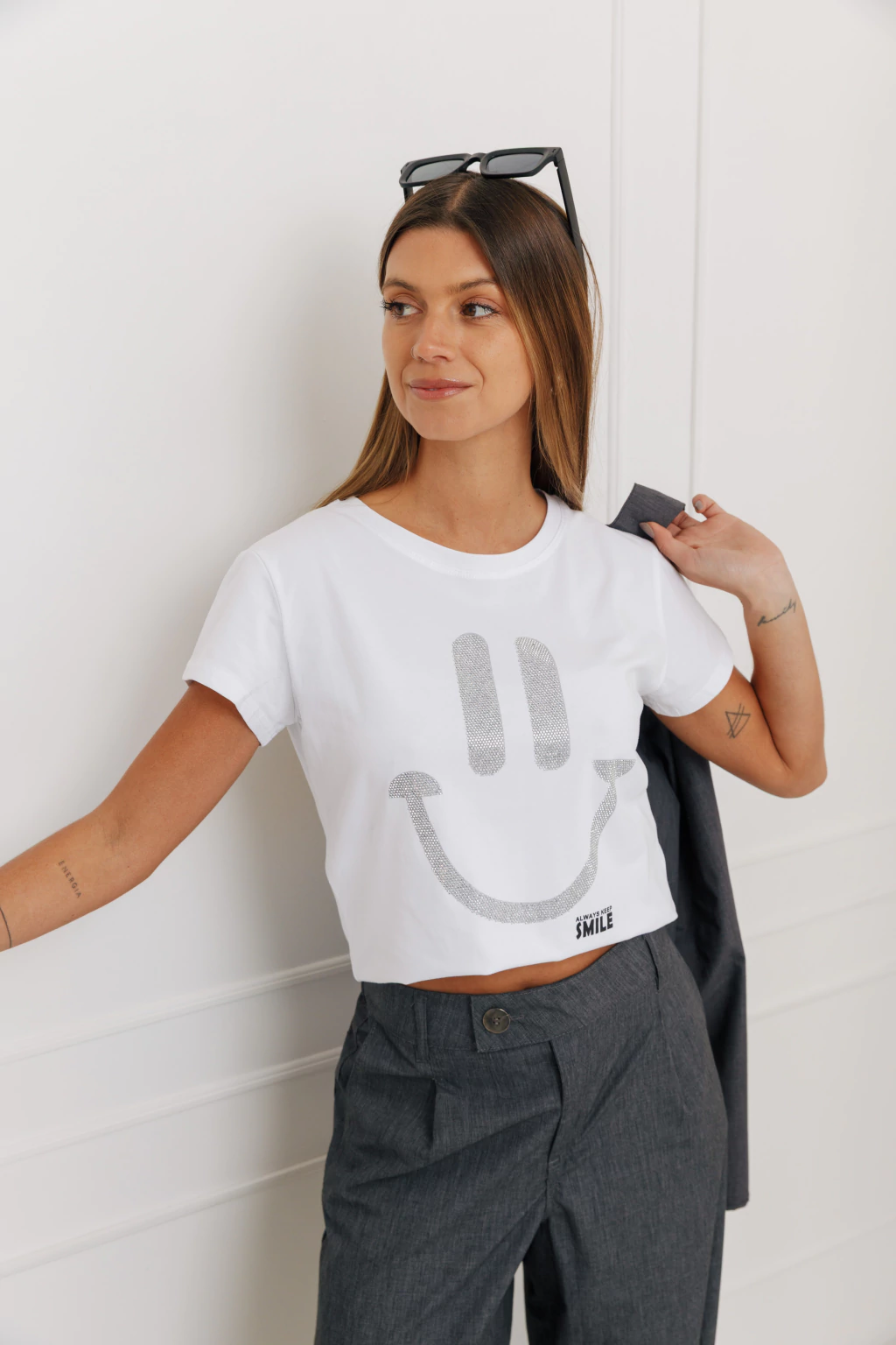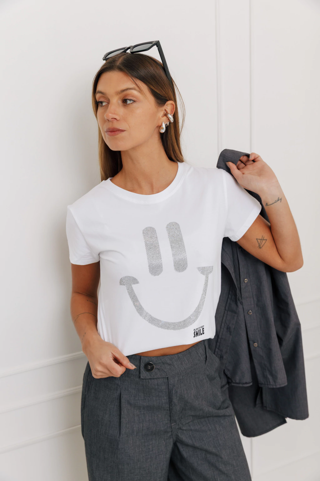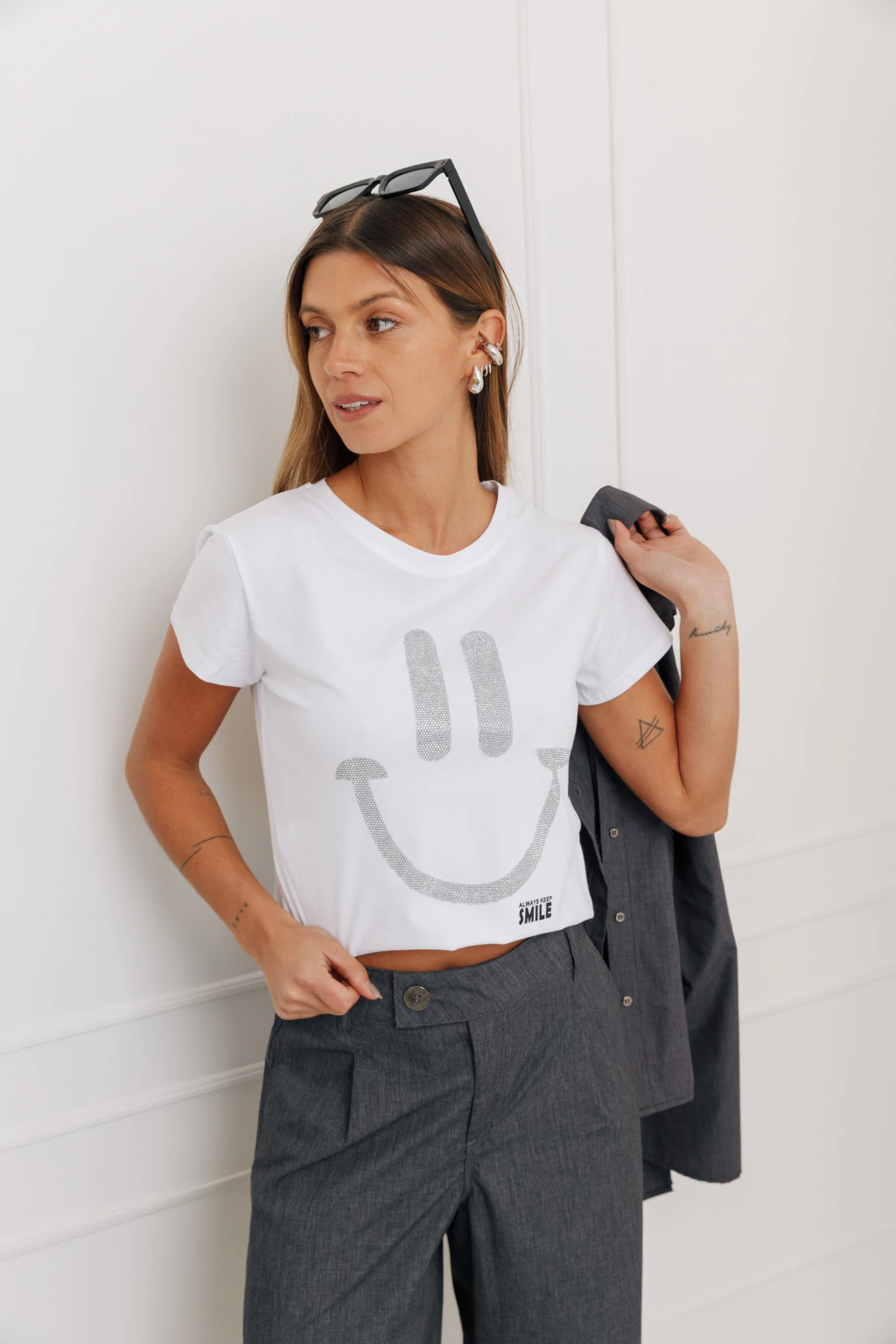 Descubrí la Remera Hortensia, confeccionada en algodón Pima blanco, reconocida por su suavidad y durabilidad excepcionales. Su diseño se destaca por un delicado hot stamp en piedra metálica, formando una carita smile que aporta un toque sutil y sofisticado.