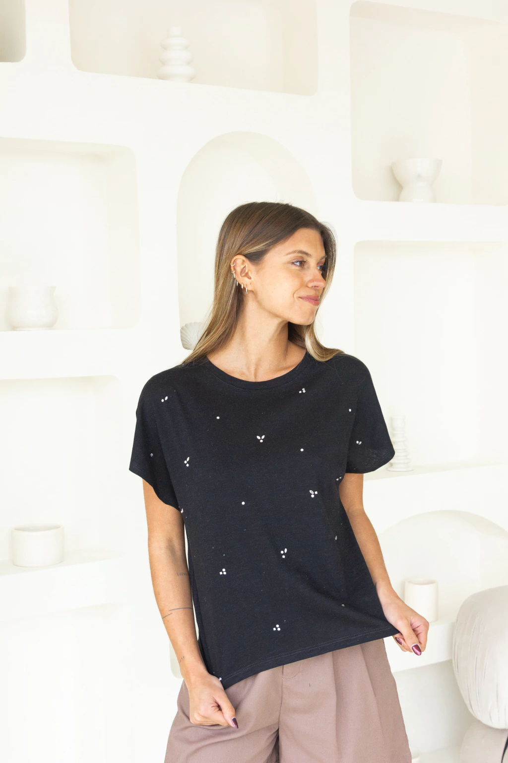 Remera NARDO Descubrí la elegancia en cada detalle con esta remera de algodón suave, adornada con delicados apliques de gemas al frente.