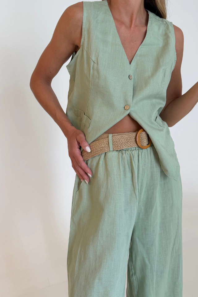 Disponible en verde menta y mocca, este conjunto incluye un cinturón de yute trenzado que completa el look con un toque natural y veraniego.