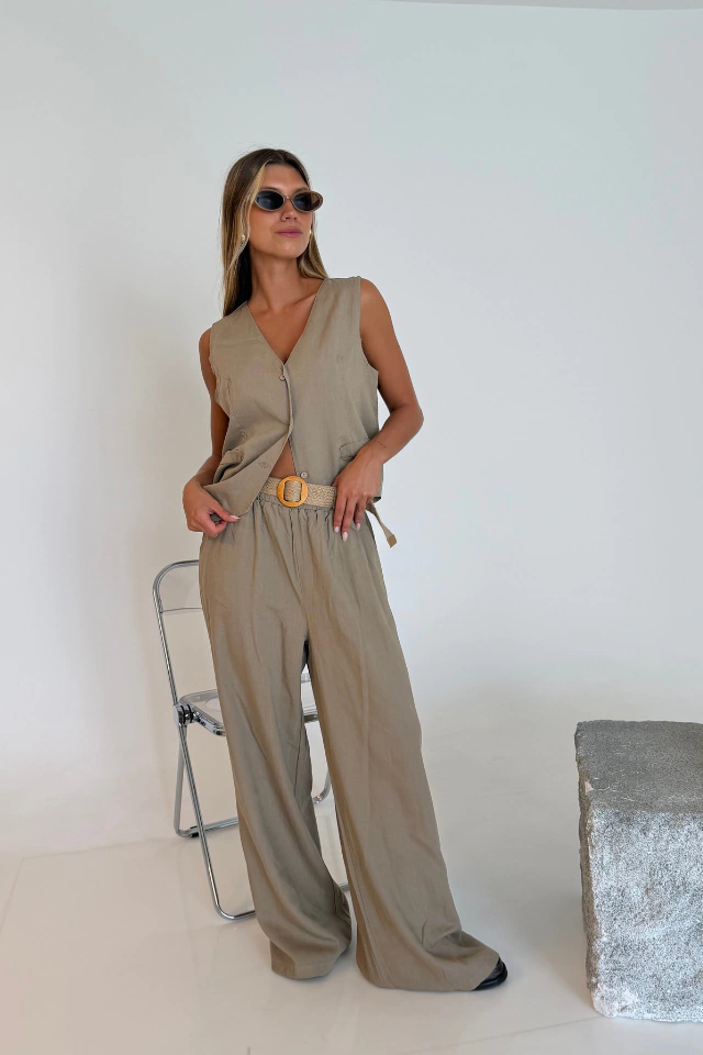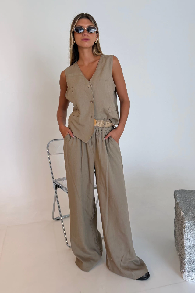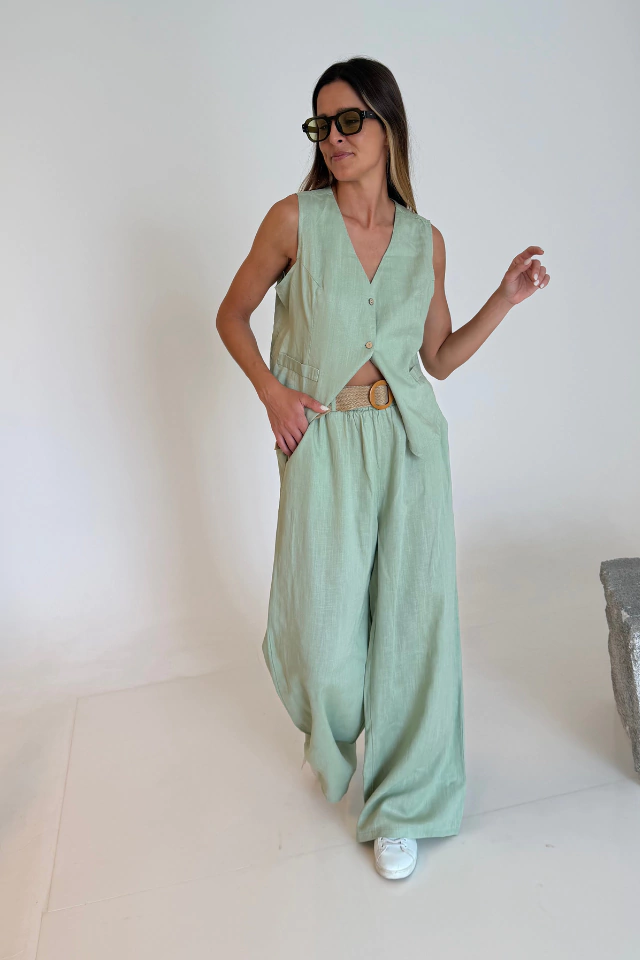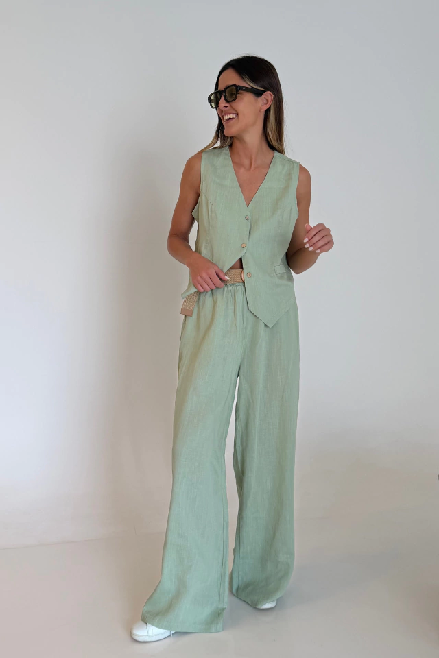 El Set Calandria está confeccionado en lino liviano, con una silueta amplia que aporta comodidad y elegancia sin esfuerzo. El chaleco tiene escote en V, botones de madera y bolsillos laterales, mientras que el pantalón presenta cintura elastizada para un calce relajado.