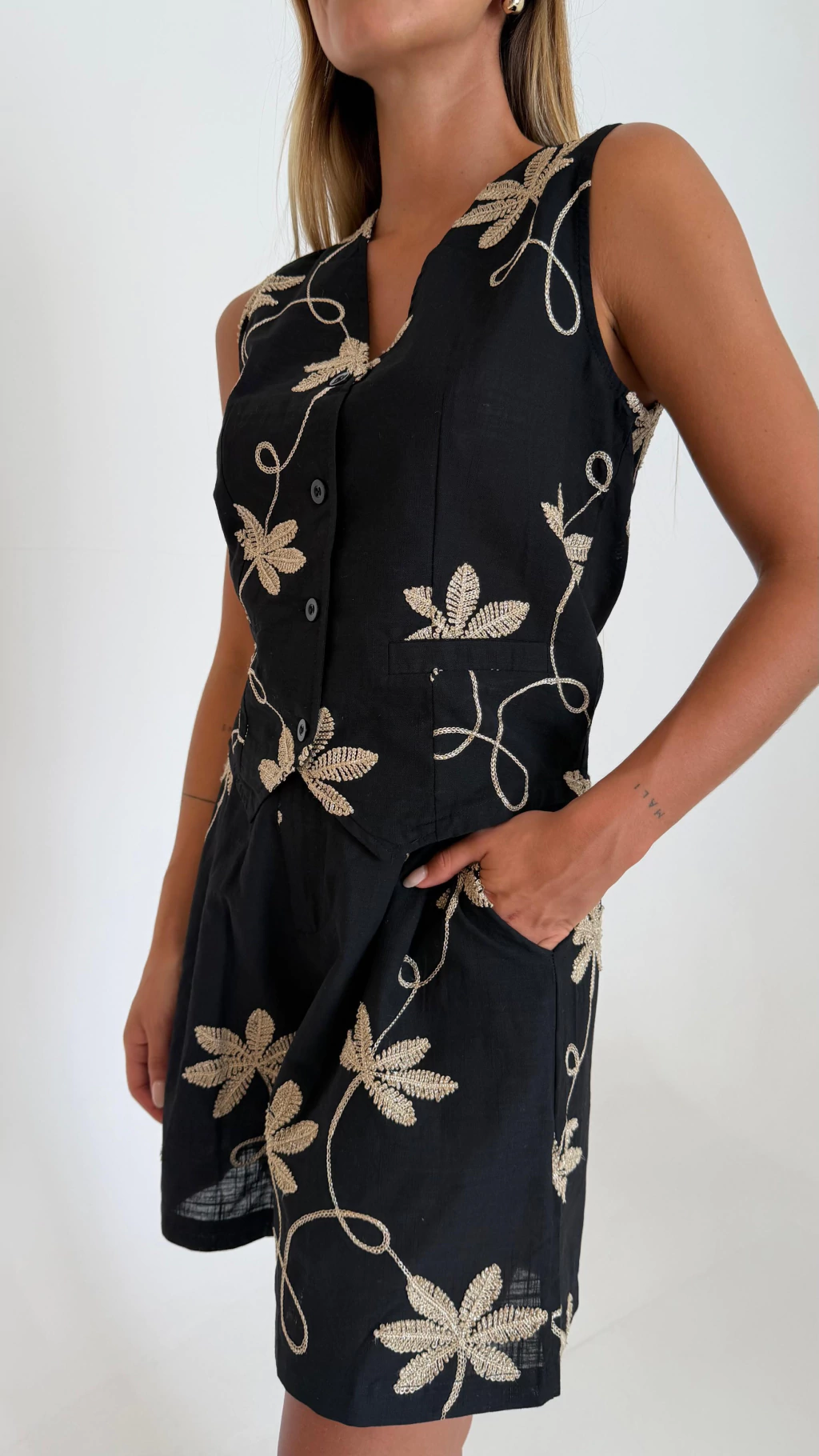 Un dúo sofisticado de short + chaleco de LINO bordado en dorado, ideal para destacar con elegancia sin esfuerzo. ?