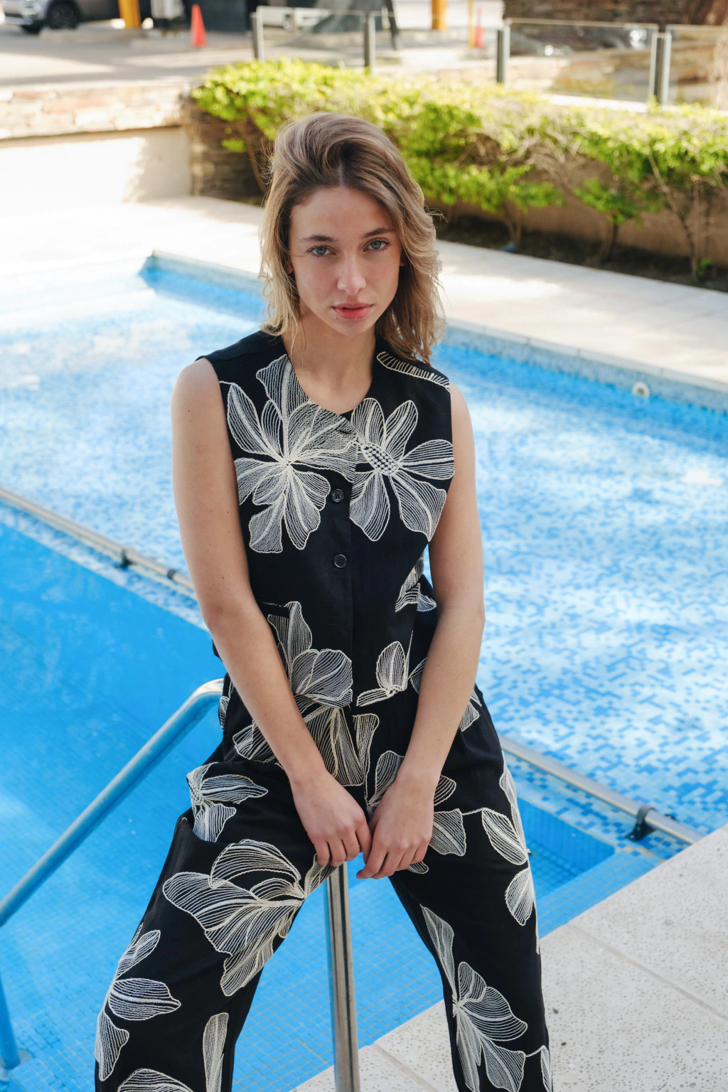 Set 2 piezas: chaleco y pantalón, confeccionado en Lino. El diseño se destaca por su estampa de flores bordadas en contraste, aportando un estilo audaz y moderno.
