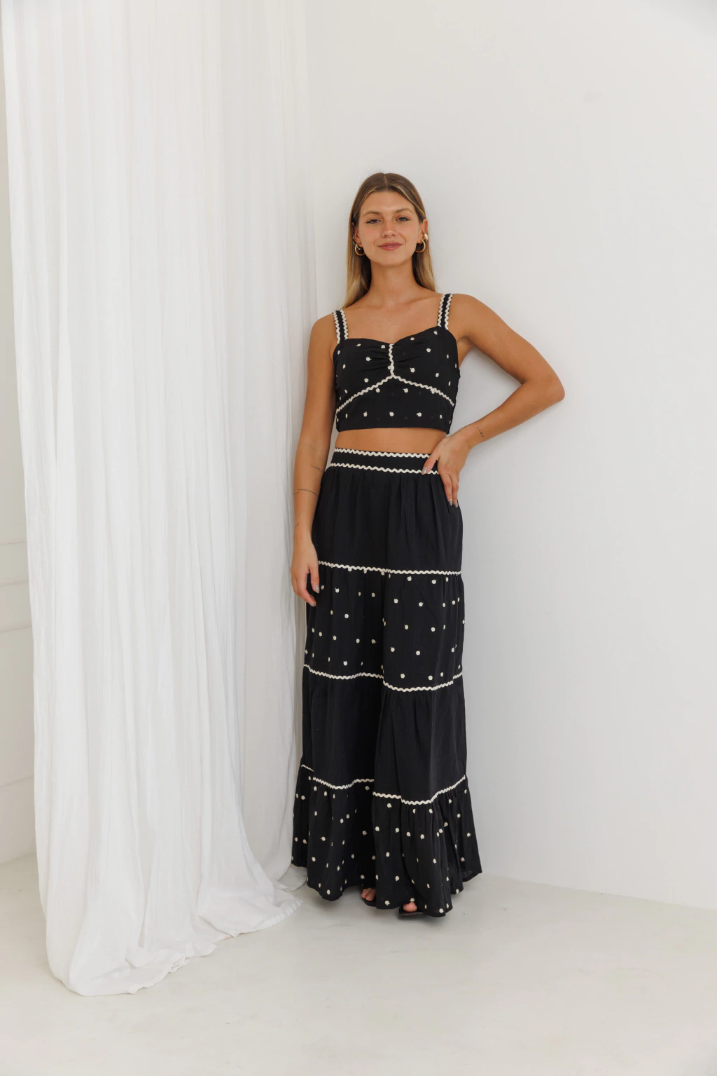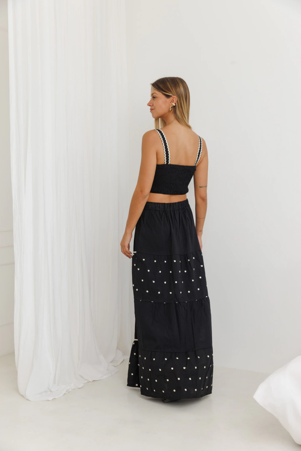 El set Jilguero está confeccionado en lino liviano, con delicados bordados en hilo crudo que destacan sobre el fondo negro. El top tiene breteles anchos, frunces en el frente y detalle de ondas bordadas que realzan la silueta. La falda es larga, amplia y con recortes en volados, ideal para acompañarte en días cálidos o noches relajadas.